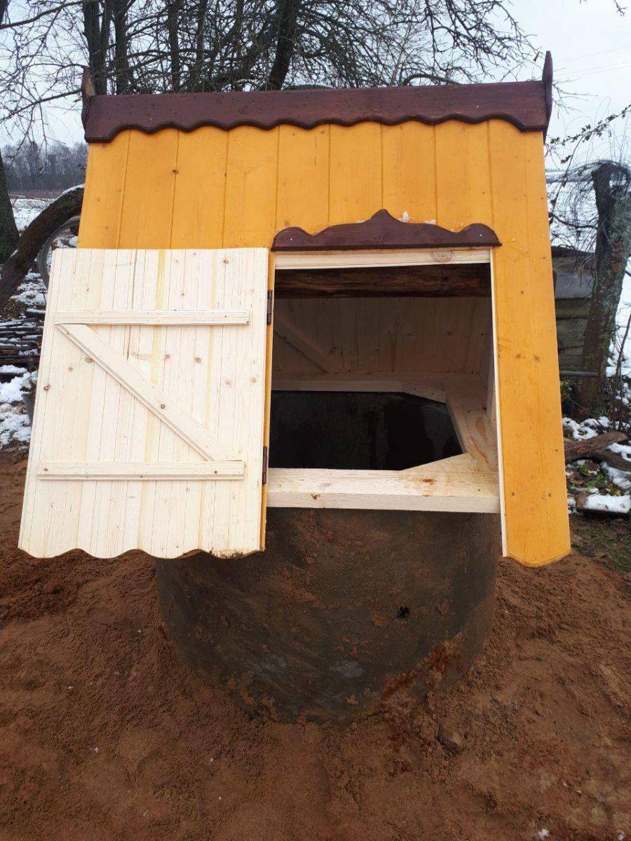 Другой вариант — сделать закрытый домик. Он по размерам немного больше колодезного кольца. Имеющаяся воздушная прослойка уже неплохой теплоизолятор, но можно защиту еще улучшить — заложив промежутки пенопластом, например.