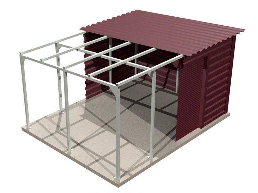 Сарай из профилированной трубы (сборка на косынках и уголках) с обшивкой и кровлей из профнастила, без утепления, на бетонированной площадке