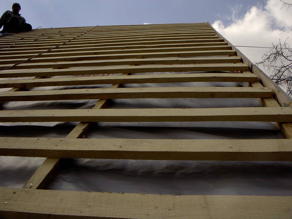 Обработайте каркас антисептическим средством. Прикрепите к каркасу доски обрешетки. Оптимально подходят доски размерами 2,5х15 см.