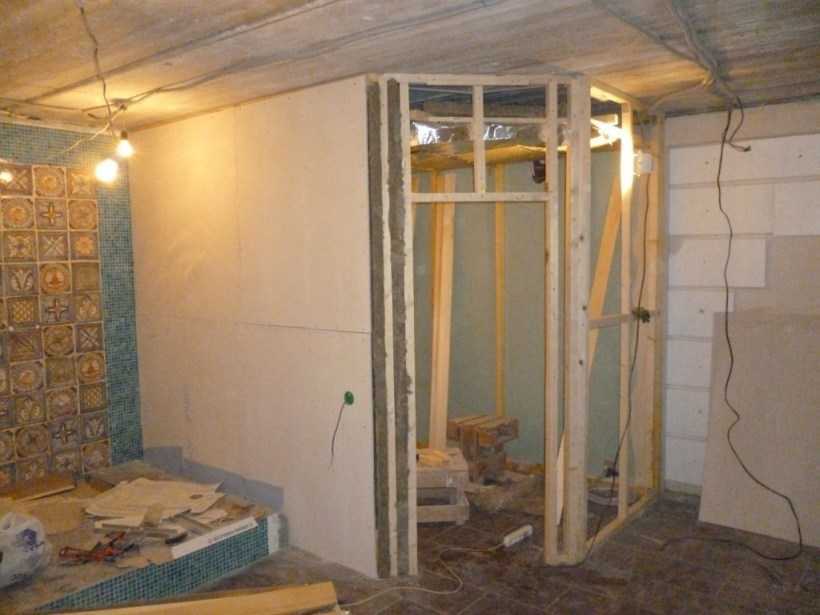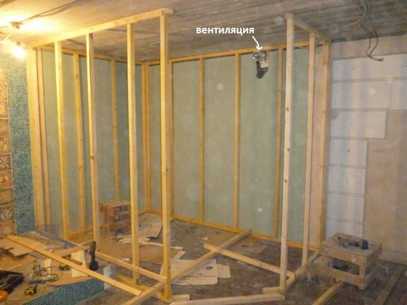 Каркас делают из брусков 5х5 см, устанавливая их вертикально по периметру стен. В углах кабины и на потолке также укрепляют бруски. Шаг между элементами каркаса выбирают, ориентируясь на размеры теплоизоляционных плит: промежуток между соседними брусками должен быть на несколько сантиметров меньше, чем толщина плиты, чтобы утеплитель лёг плотно.