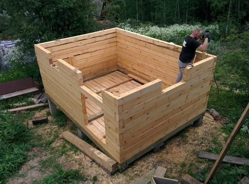 Шаг 2. Берутся доски толщиной в 3 см, ими обшивается готовый каркас. Начинать работу нужно снизу, от одного из углов. Первая доска прикладывается к брусьям, выравнивается по земле и углам, после чего прибивается.
