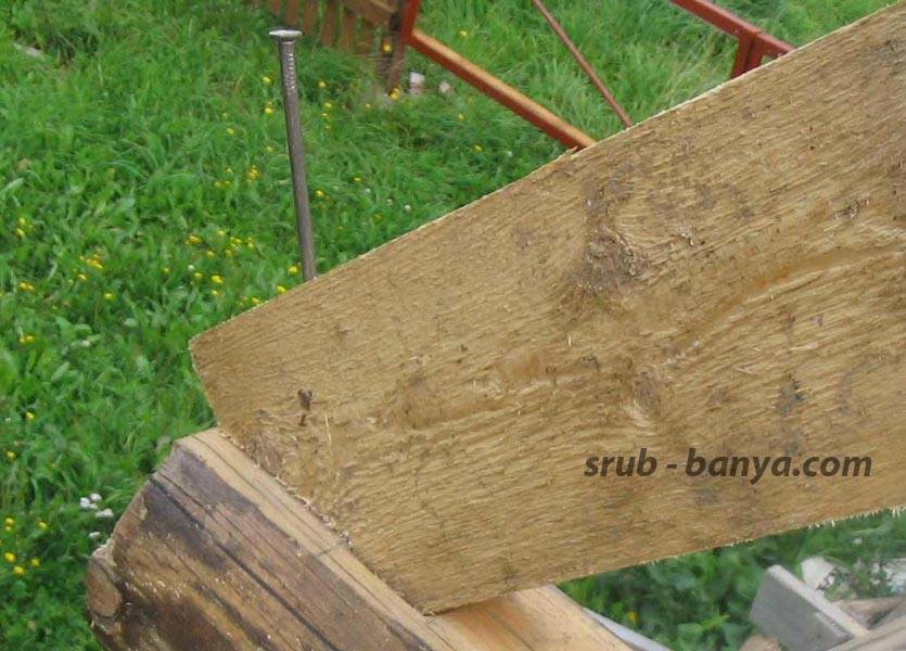 Ригель. Подгоняем верхний стык, собираем ригель с накладками, вырезаем верхние накладки стыка стропил. Для сборки применяем гвозди 100мм – «сотки». |