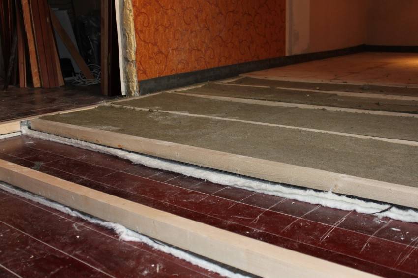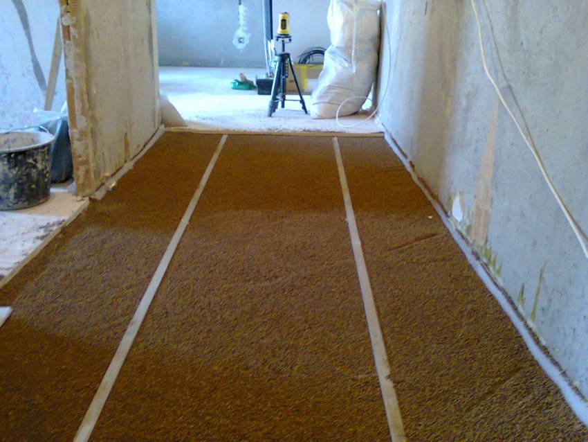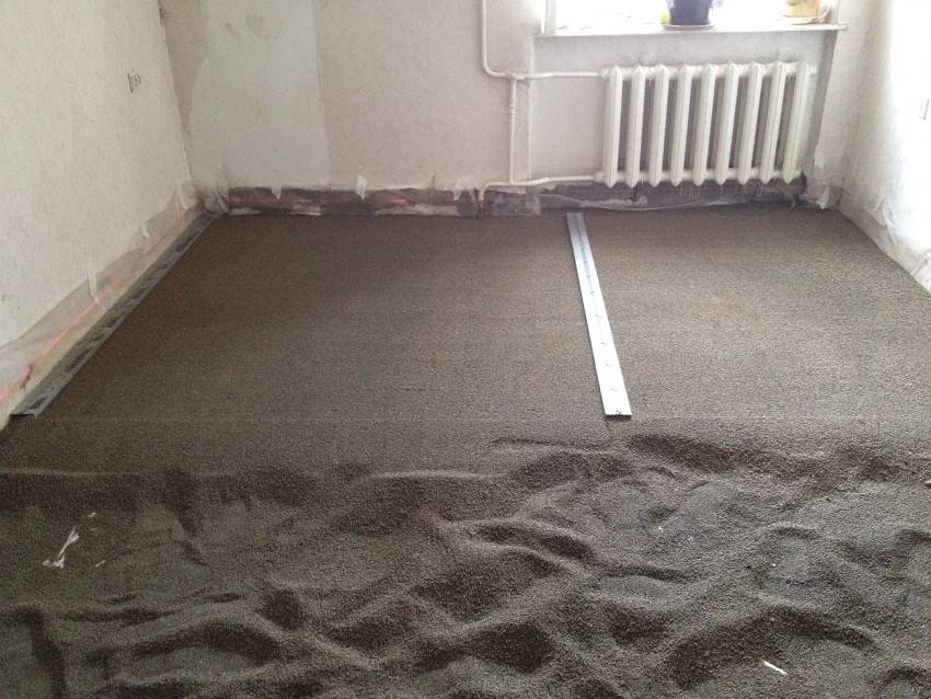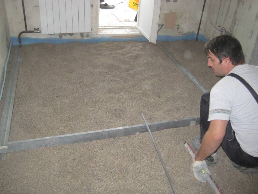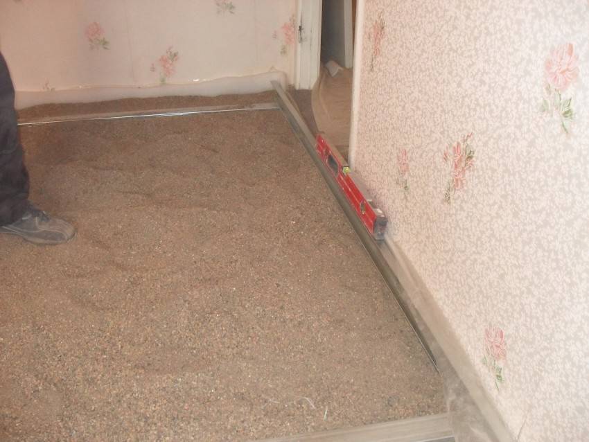 Засыпка начинается с дальнего угла комнаты, выравнивается под маяки и трамбуется с помощью резинового молотка. Идеальная толщина засыпки пола – 5 см. Она может изменяться в зависимости от неровностей, наличия коммуникаций.