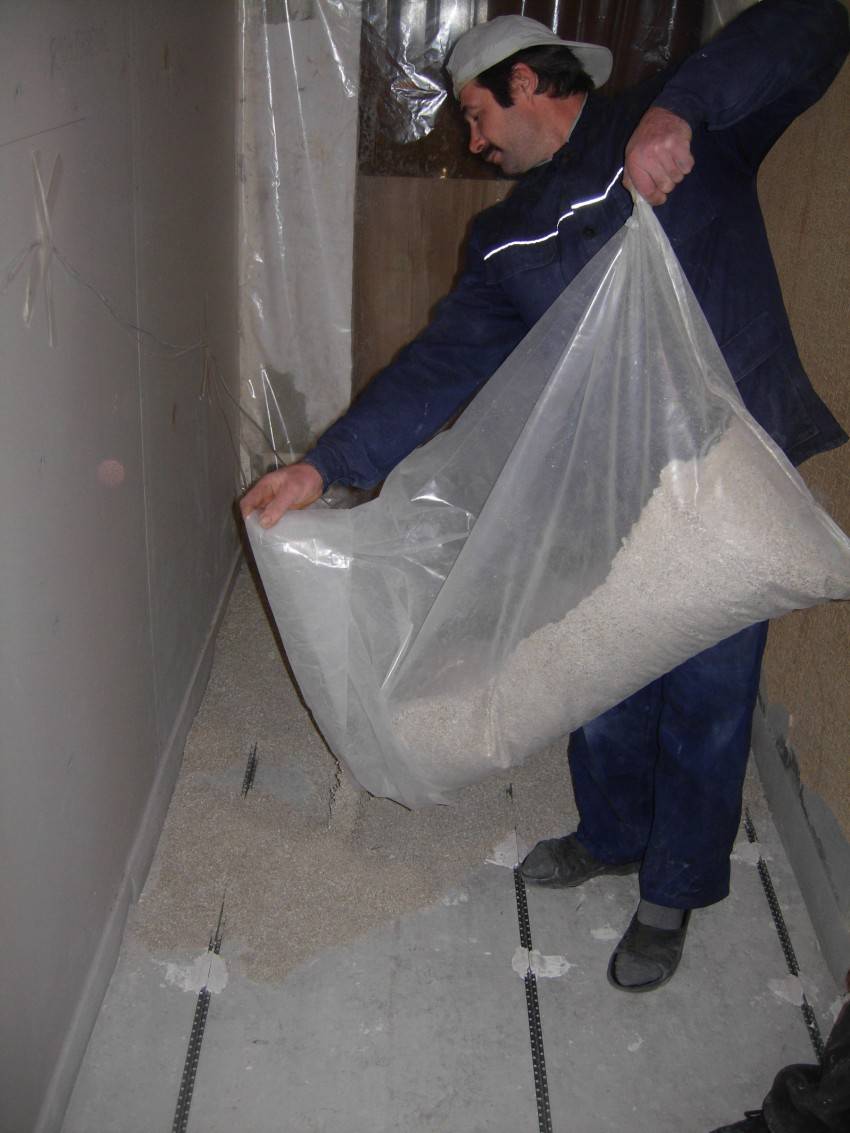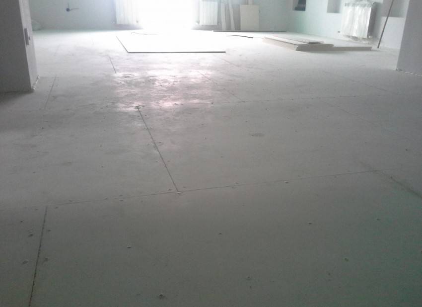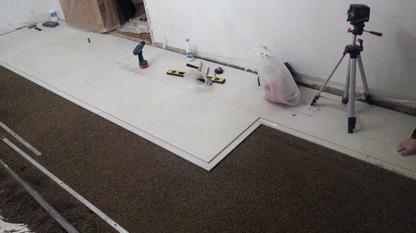Чтобы не нарушить засыпку, работы производят от входа. Края ГВЛ-листов зафальцованы, поэтому во избежание попадания песка между листом и чистовым полом, для крайних листов производится обрезка: обрезанная сторона должна соприкасаться со звукоизоляционной лентой.