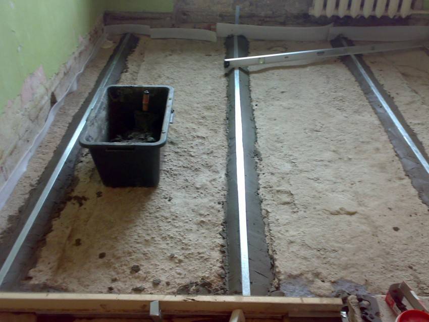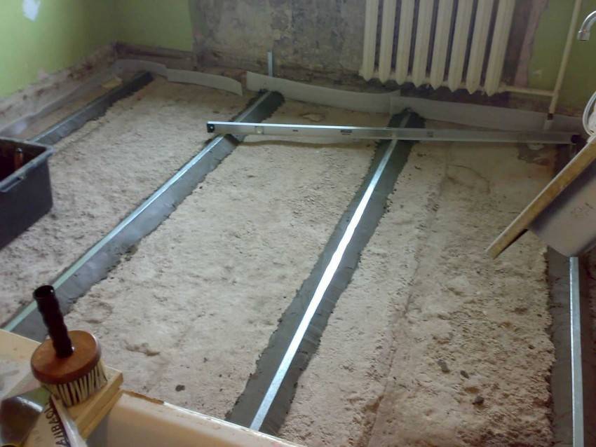 Профили выравниваются горизонтально с помощью уровня и фиксируются «ножками» вверх. Следует соотнести высоту ребра профиля и толщину засыпки.