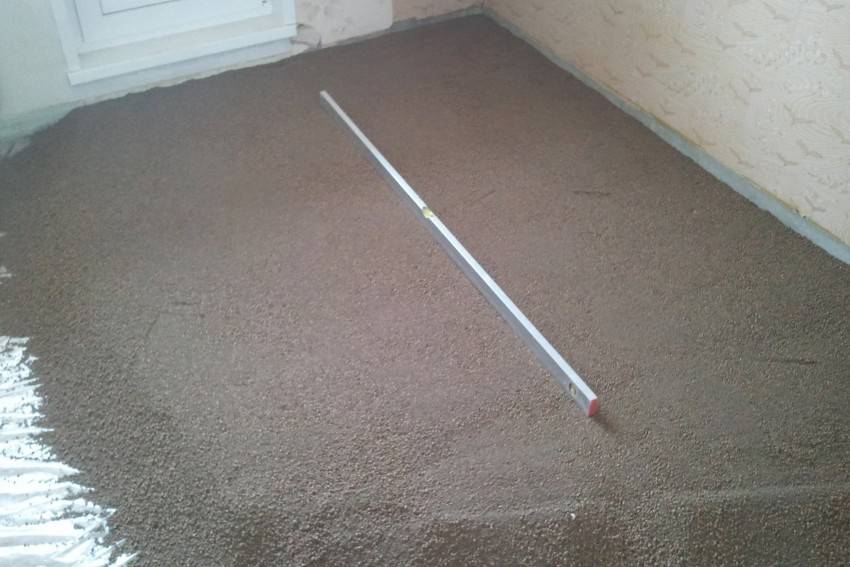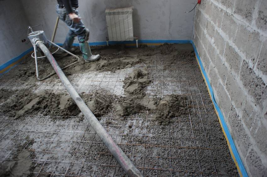 Второй метод основан на заливке жидкого бетона из цемента и песка. Эта стяжка отличается наибольшей прочностью, долговечностью и устойчивостью к влаге. Однако из-за большой массы использовать ее разрешается далеко не везде. Если выравнивается пол в квартире в новостройке, то этот вариант вполне приемлем. Только слишком толстым слоем бетон заливать не стоит. А вот для старого дома с деревянными перекрытиями такая технология не подойдет.