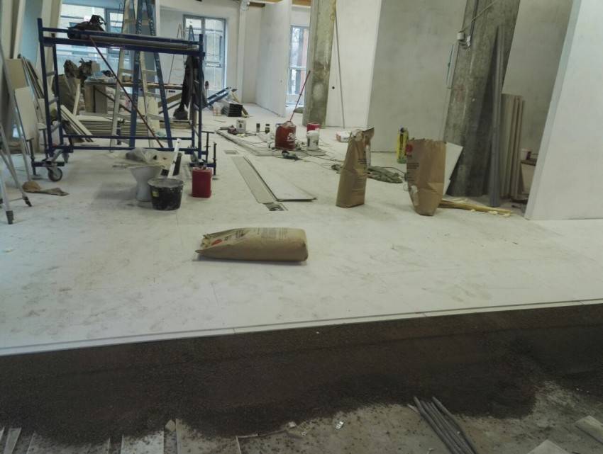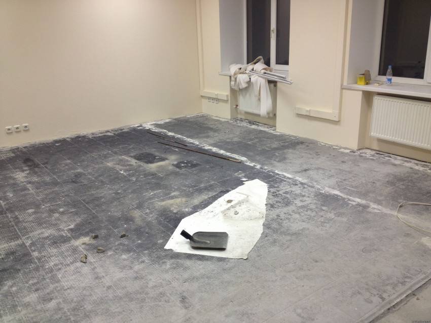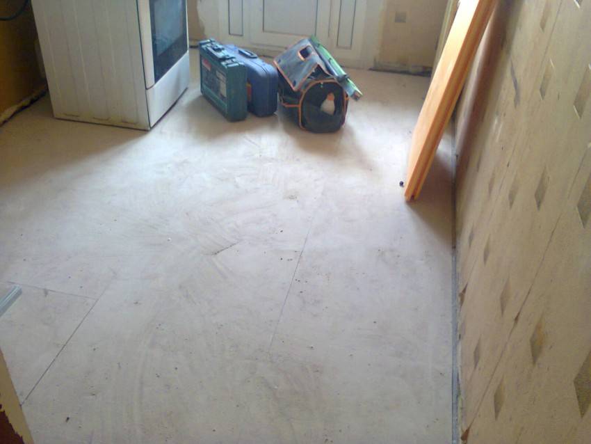 - Затем сглаживают неровности, очищают квартиру от строительного мусора, лишних предметов, которые могут помешать при работе. Необходимо исследовать пол на наличие трещин, выбоин или видимые дефекты.