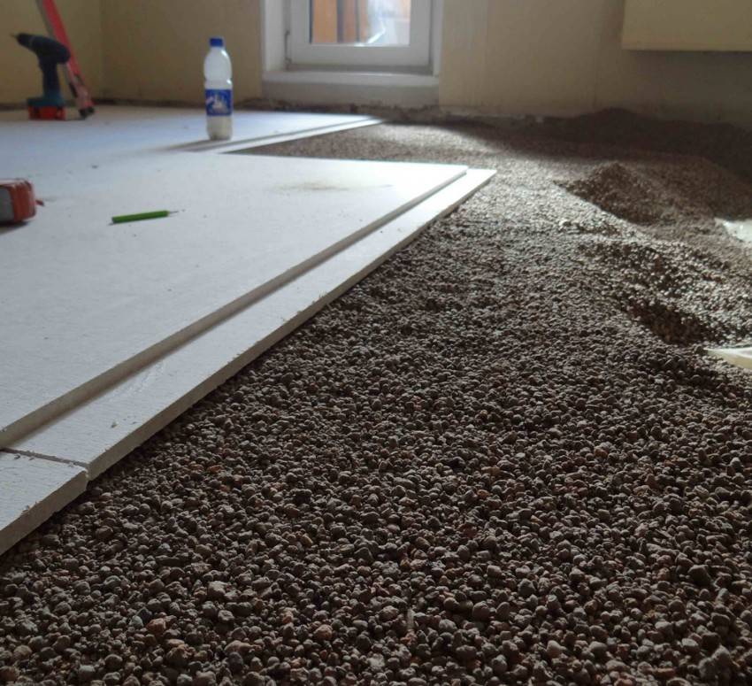 - На участках, где вы уже полноценно поработали с керамзитом, можете класть гипсоволокно. Соблюдайте между ним и стеной дистанцию 10-15 см.