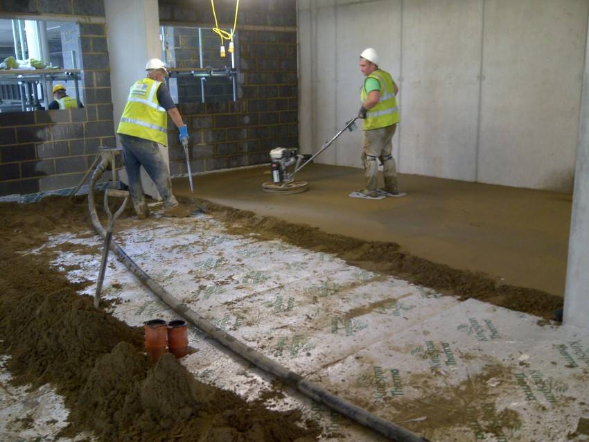 Третий способ является улучшенной вариацией второго. Здесь также используется цементно-песчаная смесь. Однако количество применяемой для ее замешивания воды в разы меньше, чем при подготовке обычного бетона. В результате существенно сокращается время застывание стяжки пола и образующиеся при работах объемы строительной грязи. Но за это приходится платить необходимостью использовать технику для шлифовки и строгостью соблюдения технологии.