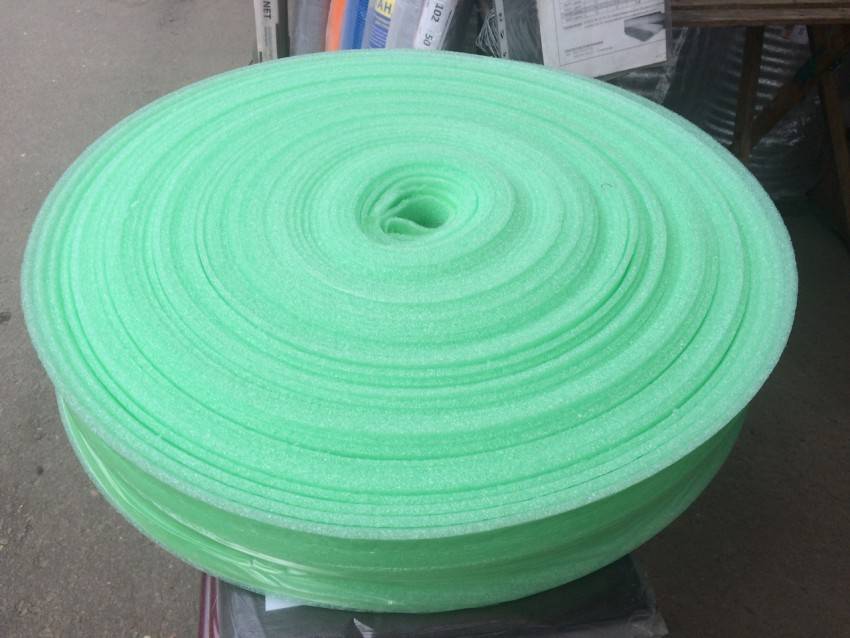 Чтобы компенсировать температурные расширения покрытия, по периметру помещения укладывается демпферная лента. Ее ширина должна равняться высоте стяжки. Это рулонный вспененный полиэтилен. Он легко сжимается при давлении и служит амортизационной прокладкой между стеной и стяжкой.