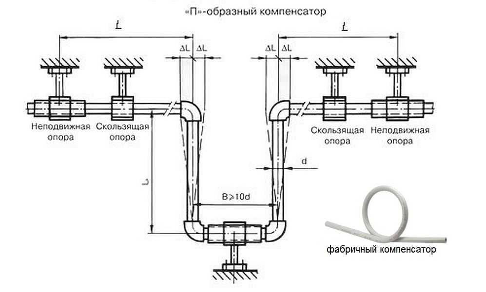 Полипропилен имеет довольно значительный коэффициент температурного расширения. Если монтируется полипропиленовый горячий водопровод или система отопления, требуется сделать компенсатор, при помощи которого будет нивелироваться удлинение или укорочение трубопровода. Это может быть фабричная петля-компенсатор, или собранный по схеме компенсатор из финигов и кусков труб (на фото выше).