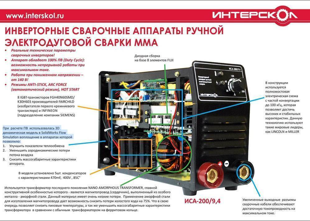 У сварочных аппаратов инверторного типа КПД достигает 90%. Электронный регулятор позволяет менять силу сварочного тока от десятков до сотен ампер. Малый вес и размеры позволяют перемещать их в сумках, например, при дачном переезде. Двойная изоляция надёжно защищает от поражения электрическим током.