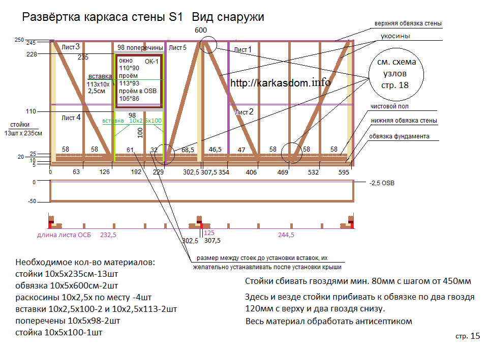 | Стены | Наличие ригеля, врезанного в вертикальные стойки, распределяет нагрузку и позволяет обойтись без дополнительной обвязки. Укрепление углов фанерными скосами. |