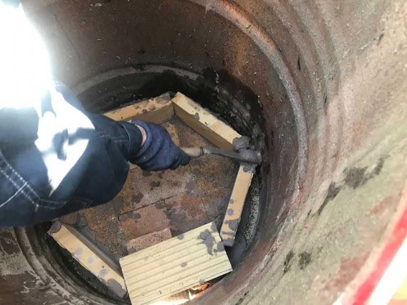 Половинками выкладывают низ до уровня 60 см кольцевой кладкой. После этого выполняется постепенное сужение рядов, пока не получится горловина диаметром 50 см. От печи делают отступ до 25 см и выкладывают цилиндр без сужений. Зазор между цилиндром и печью засыпают слоем теплоизоляционного материала. В завершение крепится дымоходная труба, дверка зольника.