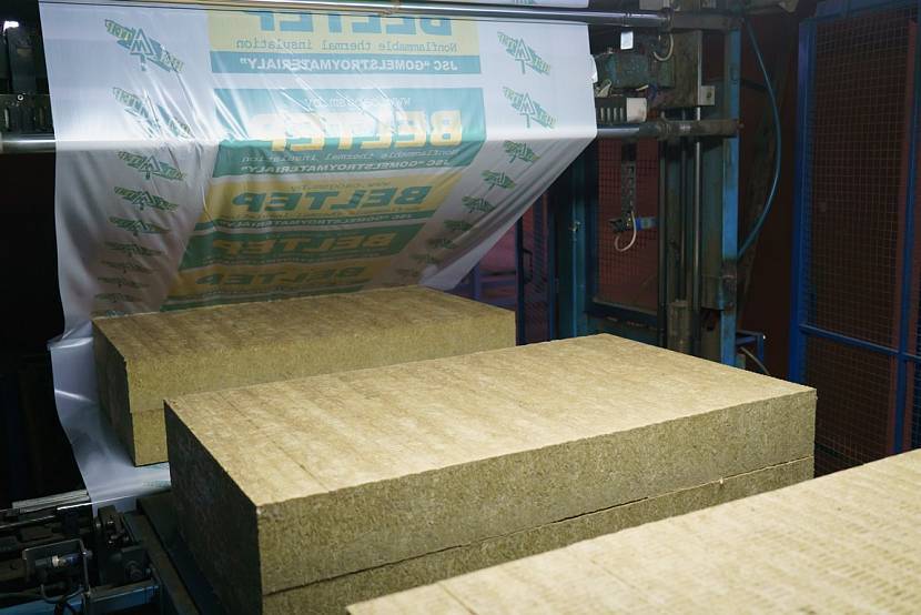 В ней волокна формируются в ковры, а им с помощью формировочной машины придается нужный размер и объем. Далее «сырая» базальтовая вата проходит через термокамеру, в которой связующие компоненты под действием высокой температуры полимеризуются, а материал приобретает требуемые свойства.