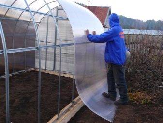 Плёнку или агрополотно нарезают по необходимым размерам и фиксируют середину плёнки на середине арок. На концах, расположенных по бокам конструкции, нужно закрепить тонкие планки и немного завернуть их в материал. В дальнейшем это позволит с удобством сворачивать агрополотно. На торцах плёнку собирают и завязывают либо тщательно подгоняют по углам;