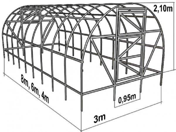 После закрепления дуг в стойках нужно изготовить из профиля двери и окна теплицы по предварительно снятым размерам.