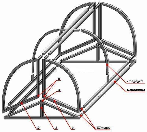 Создавая каркас из пластиковых труб, необходимо сделать уплотнение основы, чтобы она не сгибалась. Затем пластиковые трубы режутся на куски, которые будут равны размерам арки. После этого их протягивают через проемы, проделанные заранее в брусе, и сгибают в арочные дуги. Концы нужно зафиксировать очень надежно.