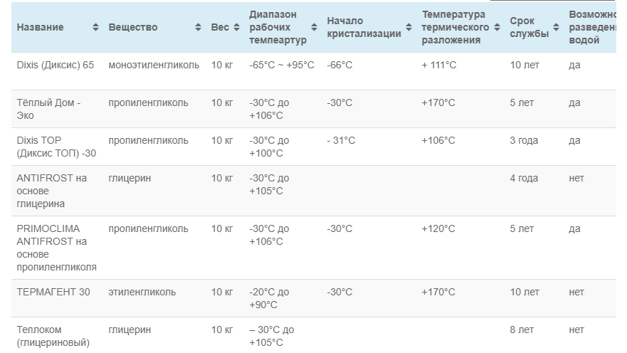 Для частных теплосистем в продаже можно найти два вида незамерзаек: водные растворы этиленгликоля и пропиленгликоля. Гликоли, в отличие от воды, при понижении температуры переходят в твёрдую фазу постепенно: диапазон от температуры начала кристаллизации до полного застывания составляет 10-15 °С. В этом диапазоне жидкость постепенно густеет, превращается в гелеобразную “шугу”, но при этом не увеличивается в объёме. Гликоли продаются в двух «форматах»:
