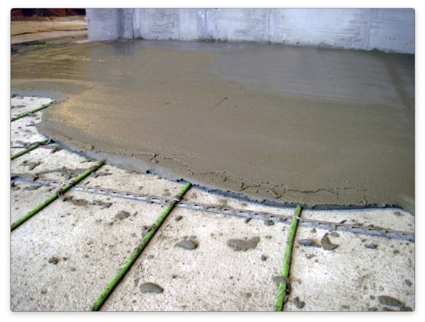 - Сверху уложенного кабеля заливаем бетонным раствором. Распределяем и выравниваем, не допуская образования воздушных полостей, способных снизить эффективность теплого пола или привести к перегреву кабеля.