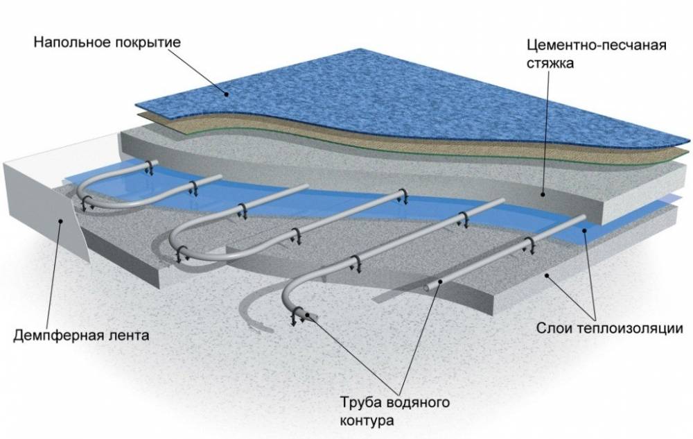 Конструкция ТП технологически сложнее традиционного отопления с помощью радиаторов. Обычно греющие трубы заливают сверху бетонным монолитом. Существуют более современные способы сухого монтажа стандартными блоками.