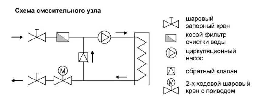 Чтобы срок службы ТП продлить до нескольких десятков лет, схему подключения с узлом подмешивания лучше не применять. С течением времени контур будет постепенно засоряться, сопротивление движению повысится, скорость потока уменьшится. Мощности насоса уже не будет хватать для обеспечения проектного температурного режима.