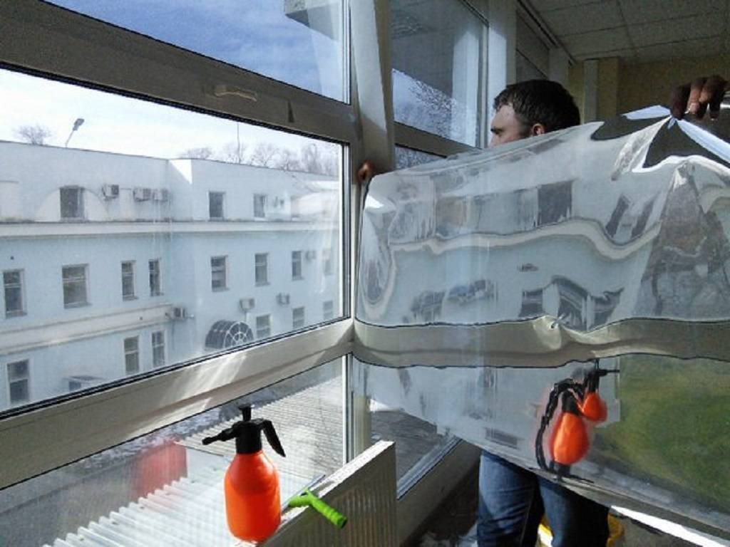 - Перед тонированием окна нужно тщательно очистить от грязи, пыли. На пленке не должно быть никаких пылевых частиц, иначе в скором времени на участках загрязнений материал начнет отклеиваться. Очищать стекла лучше моющими составами с нашатырным спиртом, обезжиривающим поверхность.