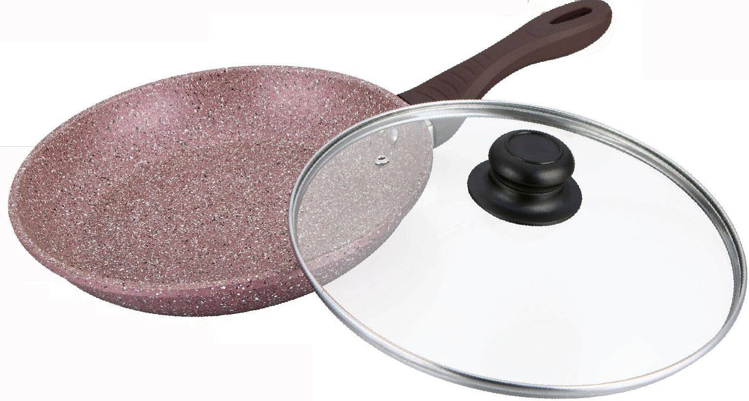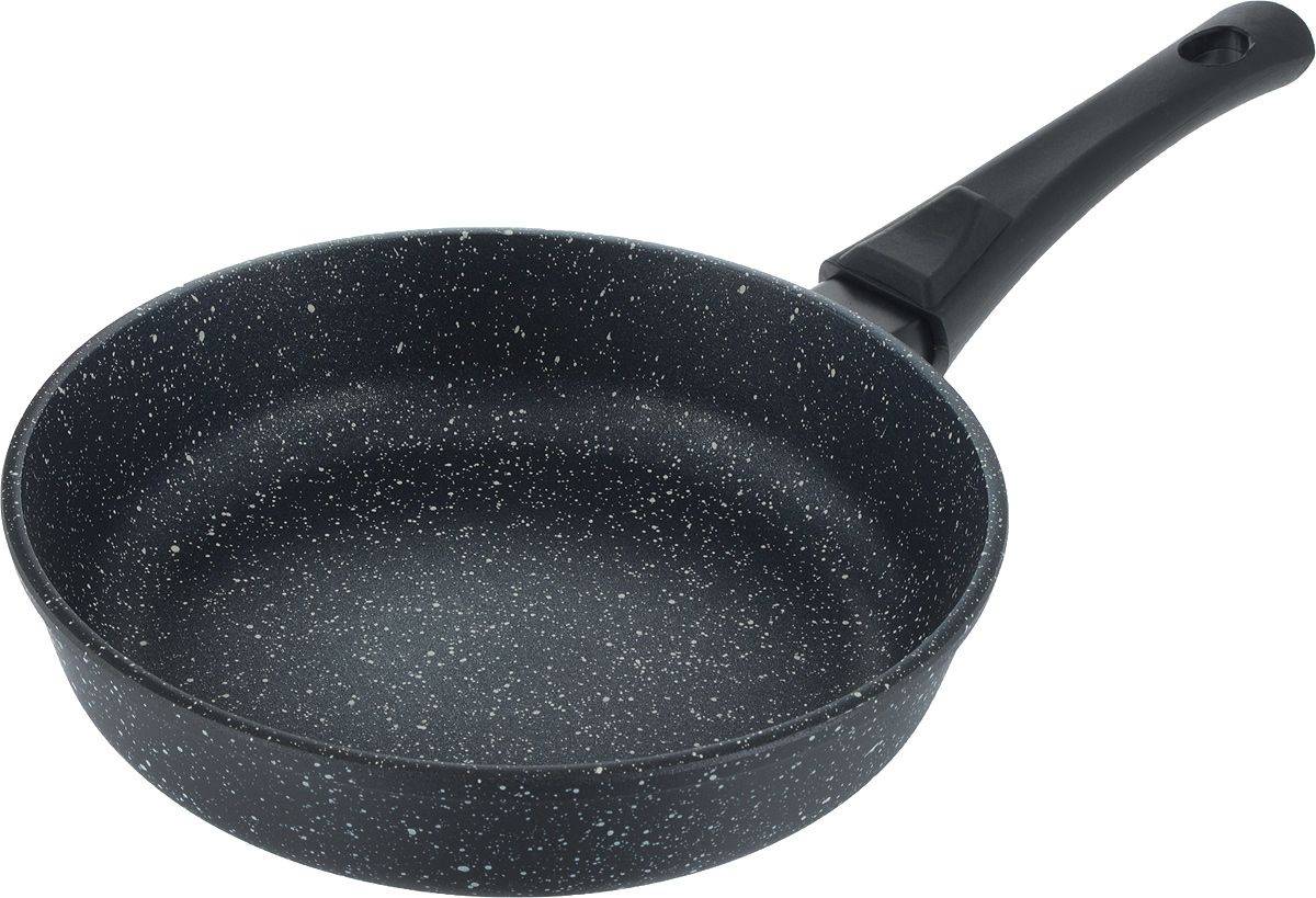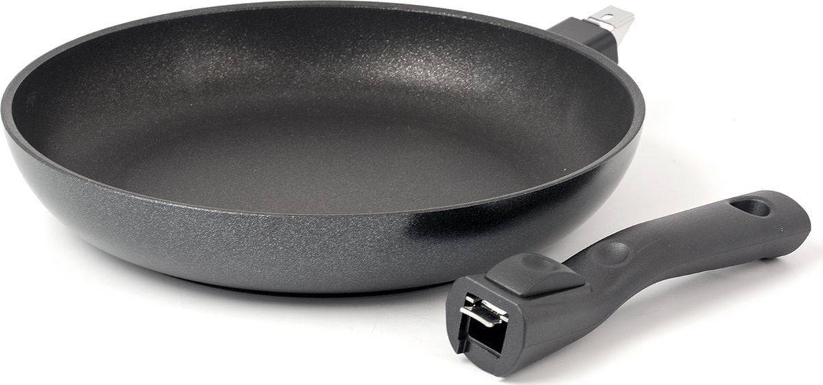 Сковорода сделана из алюминия, имеет мраморное антипригарное покрытие, которое позволяет готовить без использования масла. Сбоку находится съемная ручка, которая не нагревается при ее использовании. Толщина дна составляет 6,7 мм, она позволяет готовить блюда без излишней поджарки или горения. Модель выпускается без крышки, но за счет стандартного диаметра в 28 см на нее очень легко подобрать соответствующий размер.