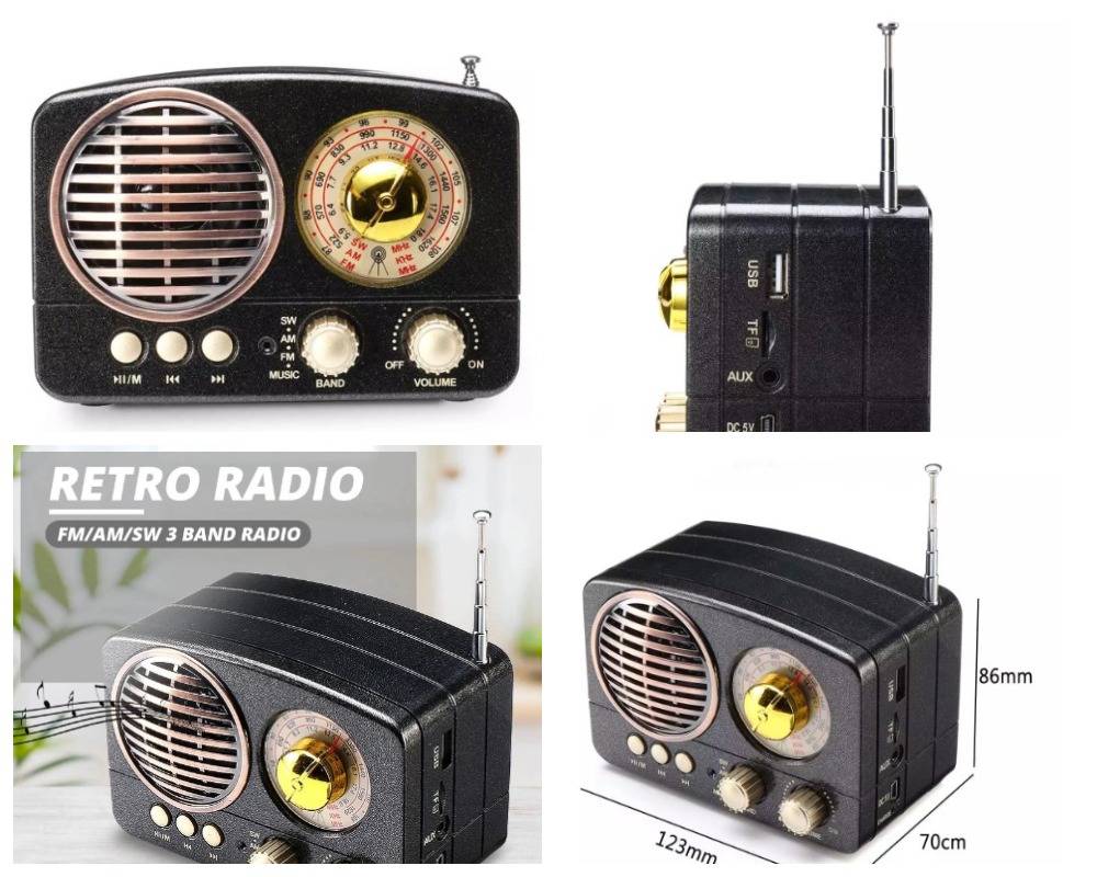 Завершает ТОП-колонок с Алиэкспресс портативный ретро-приемник, дизайн которого выполнен в стилистике 20 века: в верхней части корпуса размещена антенна, сбоку – разъемы USB, TF, AUX и Charge, а на лицевой стороне расположены кнопки управления. Все материалы качественные, поэтому в надежности устройства сомневаться не придется.