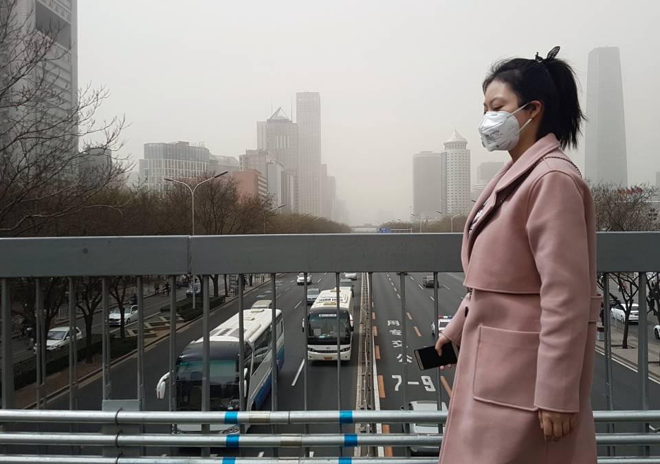 Жительница Пекина в защитной маске во время смога, 2018 год. Фото: Анна Раткогло / РИА Новости