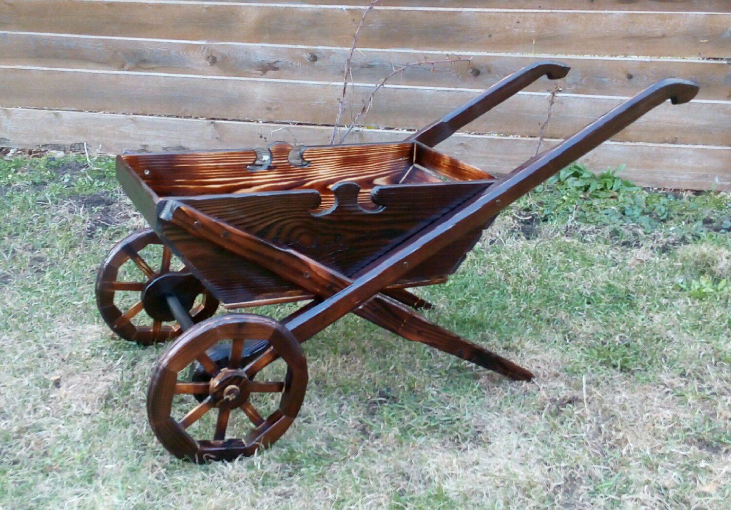 - Декоративная тачка – служит своеобразным украшением сада и клумбой. Для ее создания можно использовать разные породы дерева.