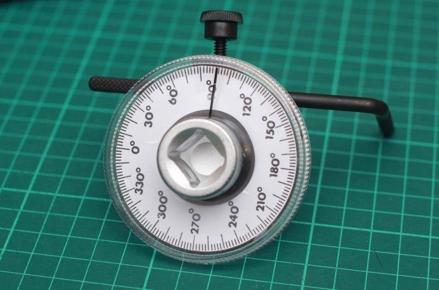 Конструктивно прибор состоит из круглого основания с градуированной шкалой в градусах от 0 до 330 градусов. С лицевой стороны этого инструмента находится квадратное отверстие, к которому присоединяется ключ-трещотка, а с тыльной стороны располагается шлиц в виде квадрата для присоединения соответствующего размера головки. Далее рассмотрим, как пользоваться угломером для затяжки болтов: