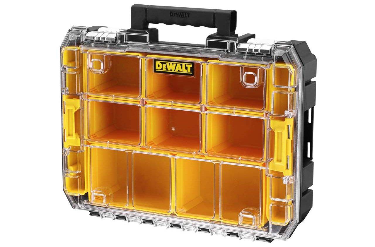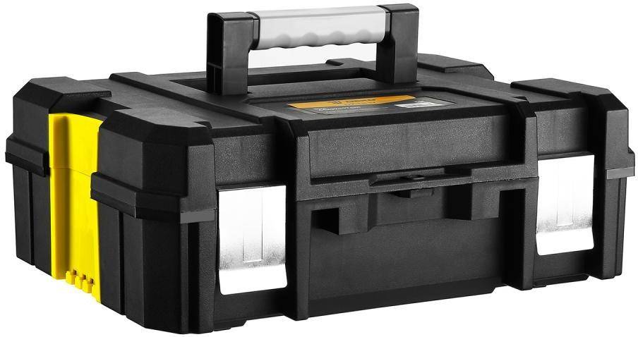 Открытые модульные ящики для инструмента собственного и стороннего производства от компании DeWalt предназначены для транспортировки электродрелей, шурурповертов. Грузоподъемность составляет 10 кг, жесткость корпуса и надежность рукояток обеспечивает ударопрочный пластик. По бокам предусмотрены застежки, которые соединят несколько модулей для размещения в них большого количества электроинструмента в мастерской. Жесткость каркаса позволяет их располагать как по горизонтали, так и по вертикали.