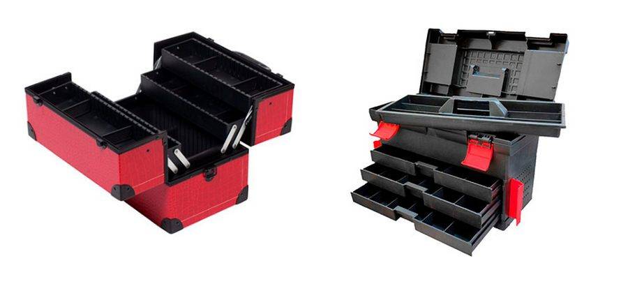 Здесь отличие от предыдущего начинается с габаритов. Кроме того, мастера предпочитают применять сразу несколько моделей, так как инструментов у них может быть слишком много, чтобы ограничиваться одним ящиком. Профессиональные продукты могут вмещать до 20 и более различных инструментов, в том числе уровень, молоток, киянка и т.п. Все зависит от специфики проводимых работ.