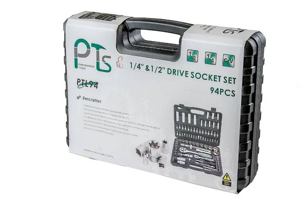 Классический набор автомобилиста, состоящий из 94 предметов. В комплект входит: две трещотки, солидный пучок имбусовых ключей, 16 бит (PN, PZ, SL, H/HEX, T/TX), 62 торцевые головки, среди которых есть свечные со вставками и удлиненные. Аксессуары представлены прямым и шарнирным удлинителем для головок, а также адаптером.