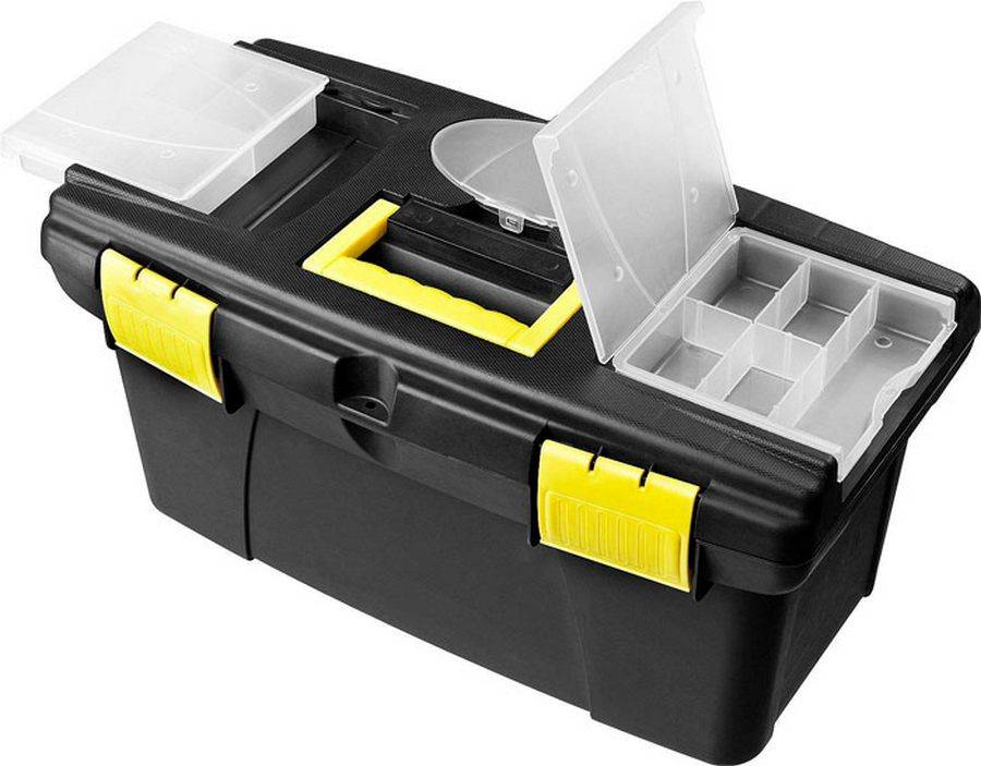 Бренд, известный на рынке РФ, пользуется репутацией добротного производителя, эта модель кейса широко востребована среди мастеров. Предназначен под организацию крепежа и мелких деталей, в наличии 10 отделов, снабжен замками из металла и эргономичной рукоятью. Главный отсек предоставляет емкость в 7.8 л., габариты изделия равны 440 на 340 на 120 мм при весе в 2.36 кг. Присутствует протекция от влаги и пыли, что защищает оснастку от коррозии.