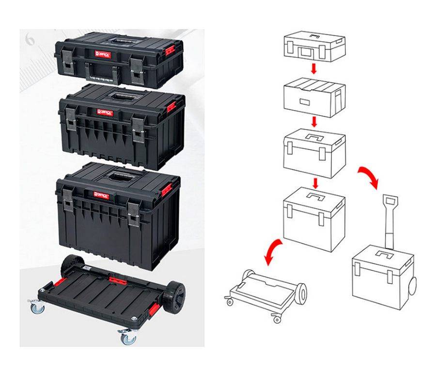 Большие ящики оснащаются отделениями, ручками, колесами. Контейнеры ставятся один на другой, что исключает потерю элементов.