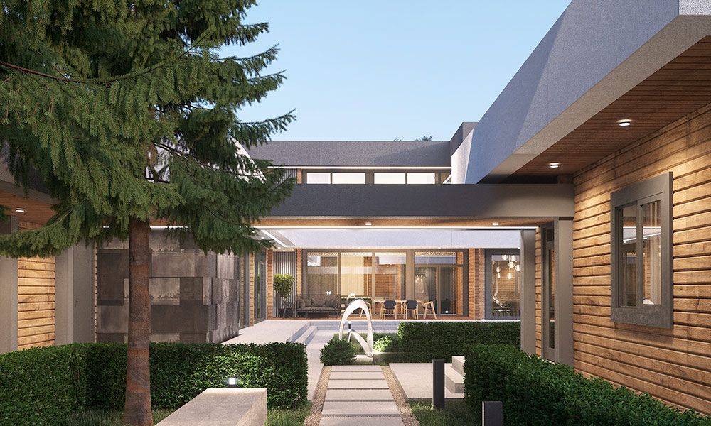 Вдохновленный минималистской архитектурой калифорнийских домов заказчик предложил сделать проект именно в таком стиле. Чтобы соответствовать критериям экологичности и безопасности, как основной строительный материал выбрали термообработанный брус, сравнимый по характеристикам с клееным брусом, но не содержащий ни капли клея. Для деревянного дома в стиле минимализм разработали деревянно-металлические конструкции, позволившие использовать в проекте панорамные окна. Энергоэффективность постройки обеспечат оконный профиль Schuco с мультиостеклением, системы умной вентиляции и умного отопления, дополнительная теплоизоляция. Строительство дома планируется в поселке Лазурный берег, г. Мытищи.