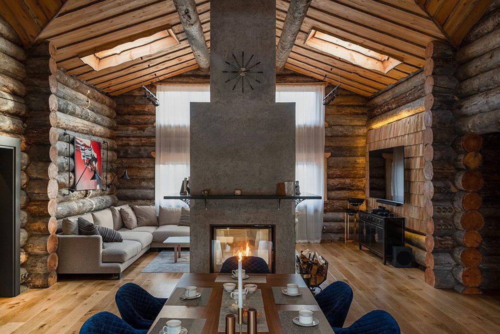 Архитектурное решение образа дома — объемно-пространственная композиция горизонтальной направленности, симметричная в своей основе и подчеркнутая линиями кровель, архитектурными элементами и деталями. В проекте современное видение сочетается с традициями деревянного зодчества. Широкие, относительно пологие кровли объединяют и зрительно и фактически занижают объем, усиливая связь дома с ландшафтом. В гостиной много света — это позволило выбрать темно-серый цвет для отделки двустороннего камина.