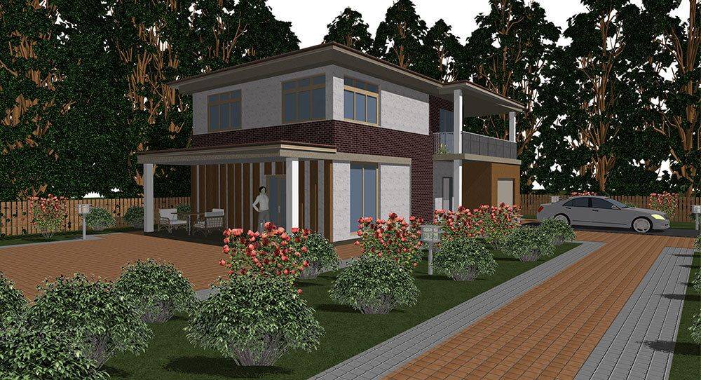 Яркий пример сочетания классического стиля и современного — планировку можно переделать под потребности будущих жильцов. Вход размещается по центру фасада, над ним расположен фронтон со стильными оконными проемами. Крыша двускатная наклонена под углом 45 градусов. Фронтон со стороны двора крупнее, чем со стороны фасада. Раздвижная дверь выходит на патио. Наверху размещается место для отдыха. Есть гараж на 2 машины, кладовая и навес. Занимает 136,14 кв. м.
