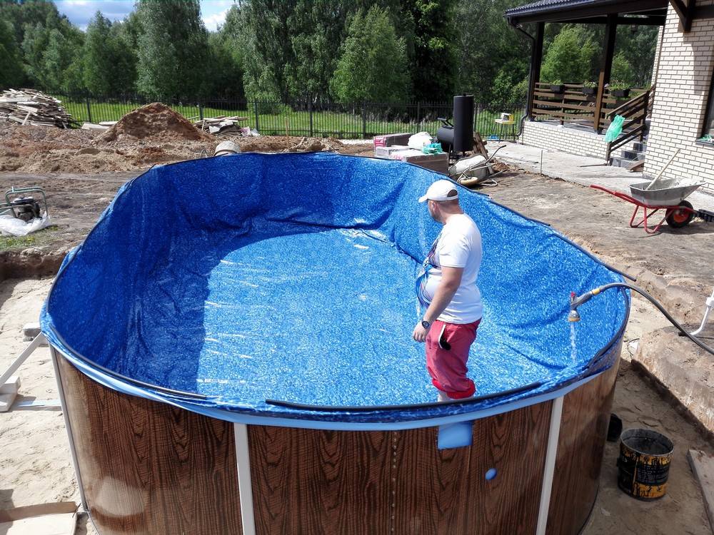 | Более сложная установка, с применением опорных металлических трубок. Требуется подготовка поверхности земли. Стальные стойки частично компенсируют наклон участка. | Прост в установке (закачал воздух, залил водой и можно купаться). Поверхность участка должна быть ровной, так как вода давит со всех сторон, из-за чего может переливаться. |