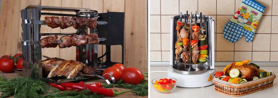 Существует два типа электрошашлычниц: вертикальная и горизонтальная. В первом случае это цилиндр с 4-11 шампурами. Во втором вместительность больше, до 24