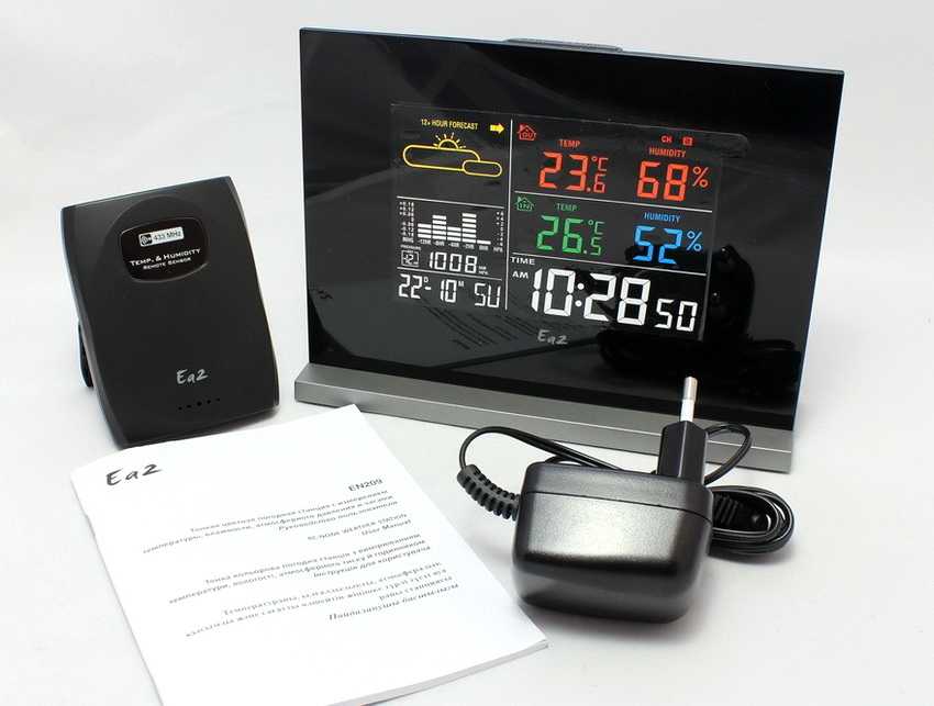 - метеостанция EA2 BL508 — модель имеет элегантный черный корпус толщиной менее 20 мм. Данные устройства могут выпускаться в алюминиевом или сером пластиковом корпусе с металлическим обрамлением вокруг экрана. Благодаря специальной ножке-опоре может быть установлен на ровную поверхность. Прибор комплектуется беспроводным датчиком. Погодный комплекс фиксирует температуру на улице и в помещении, с регистрацией максимальных и минимальных показателей, а также влажность, давление. Отображает диаграмму давления и прогноз на сутки и 12 часов посредством погодных символов. Из дополнительных услуг — календарь на восьми языках (в т. ч. русский, английский), будильник с опцией «короткого сна», голубая подсветка;
