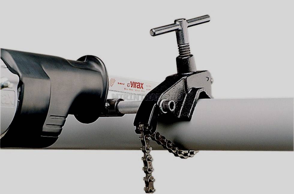 Разновидностью роликовых механизмов являются цепные труборезы. Устройство представляет собой щипцы, на которых закреплена цепь с роликами-ножами.