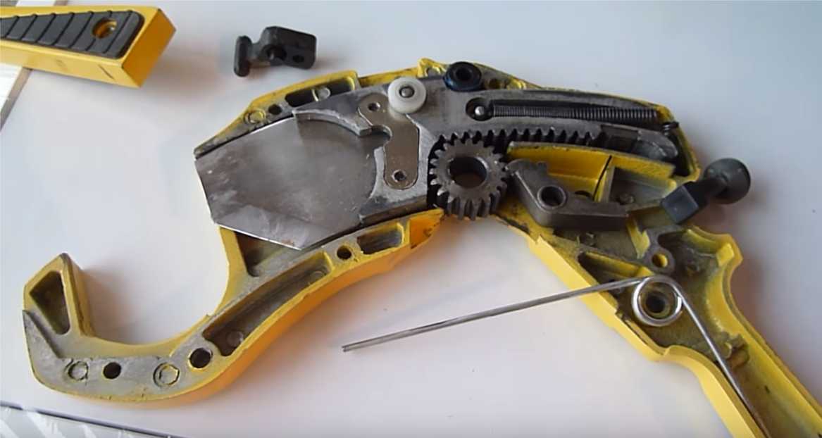 Этот режущий прибор визуально напоминает по форме пистолет. Для осуществления разреза, труба располагается на полукруглой платформе спереди, а режущий элемент заводится к ней сбоку посредством неоднократного нажатия на рукоять (опять же, в конструкции используется храповый механизм). Возврат же лезвия в первоначальное положение осуществляется по нажатию на специальную кнопку. И здесь также необходимо отметить, что храповый способ снова побеждает пружинный, так как предполагает приложение меньших усилий со стороны оператора. У пистолетного типа режущие части могут быть сменными или могут подвергаться повторному затачиванию.
