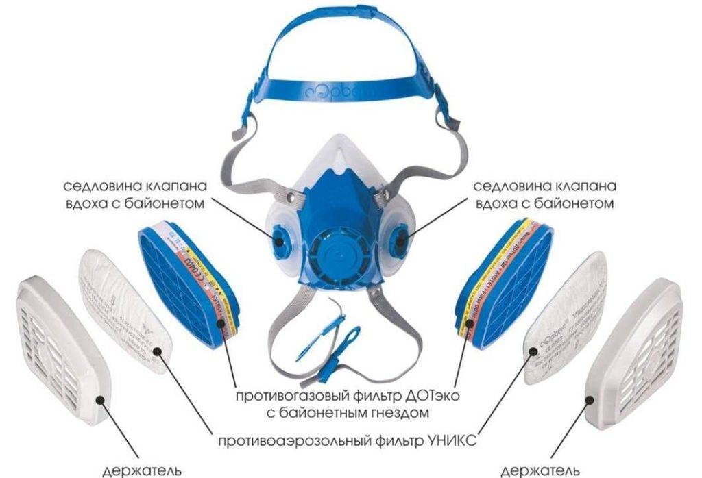 На этапе отделки помещения можно использовать обычную маску, а при работе с аэрозолями необходим респиратор с картриджами;