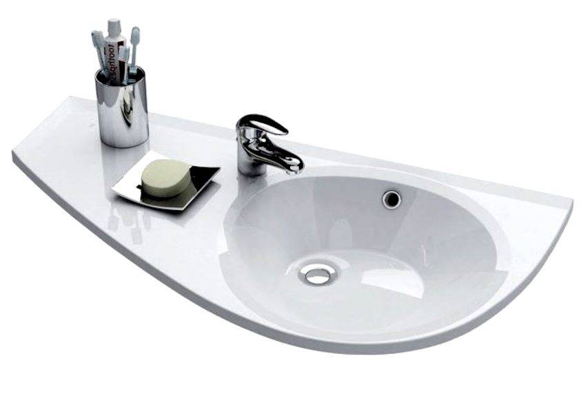 В ванной, зачастую, свободного места всегда не хватает. Модель позволит решить эту проблему посредством горизонтального крепления, вытянутого вдоль стены. Оригинальный и необычный внешний вид, позволит освободить площадь для других конструкций. Вдоль умывальника расположена длинная полочка, которая позволит разместить огромное количество косметических средств. Габариты: 45х80 см. Для изготовления используется смола и доломит. Перелив отсутствует, что приводит к необходимости его самостоятельного конструирования.