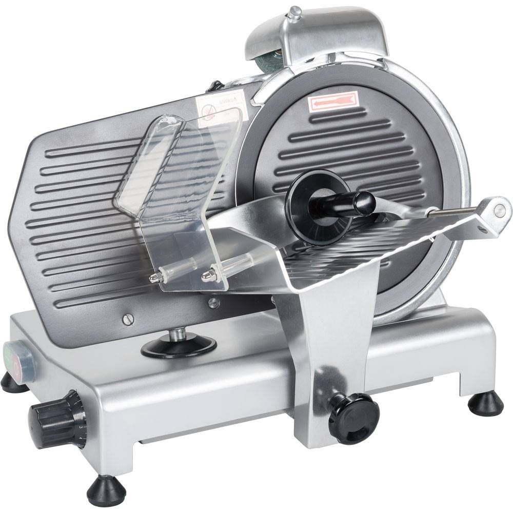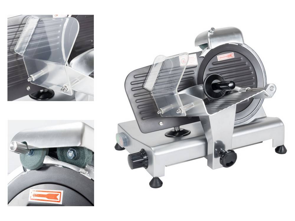 Корпус алюминиевый, облегченный: надёжный и одновременно удобный, если ломтерезку нужно переставить. Функционально прибор предназначен под нарезку сыров, колбас, мясных деликатесов. Выдает аккуратную нарезку с одинаковой толщиной. Модель полуавтоматическая, подача продукта к ножу происходит вручную. Установлено защитное устройство, исключающее порез руки. Основание модели поставлено на нескользящие каучуковые ножки, что исключает перемещение прибора во время резки. Максимальный временной период нарезки (до 10 минут) позволяет нарезать несколько килограммов колбасы. В наборе затачивающее устройство.