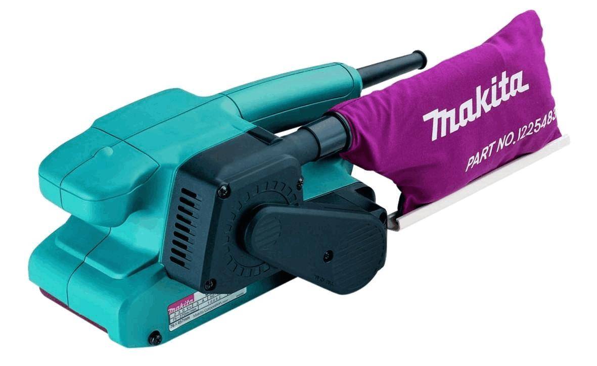 - Makita 9910 является машинкой из профессиональной серии, ее отличает качественно сбалансированные узлы, эргономичность рукояток и корпусов. В комплектации имеется объемный мешок, который собирает стружку, пыль. Пусковая кнопка имеет возможность блокировки. Сменить шлифовальную ленту можно быстро и просто. Ход абразивной оснастки довольно точный. Инструмент пользуется спросом благодаря простоте и легкости в применении даже с помощью одной руки. Машинка характеризуется надежностью, качеством сборки, удобством корпуса и хорошей балансировкой. Из минусов можно отметить небольшую мощность, отсутствие регулировки скорости.