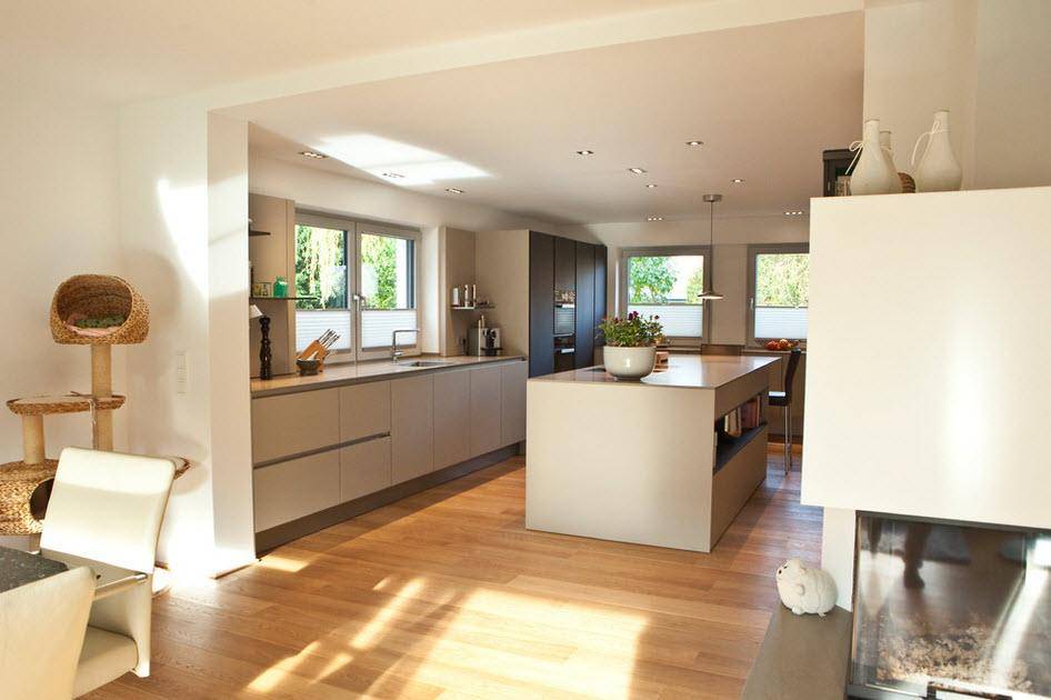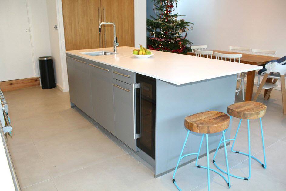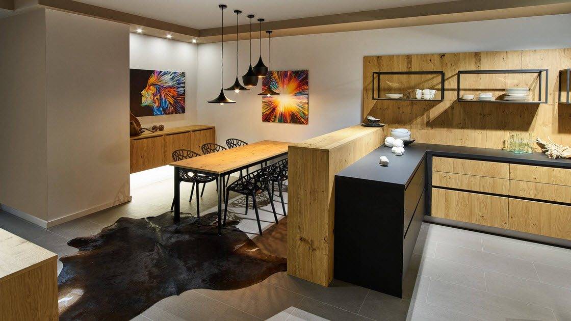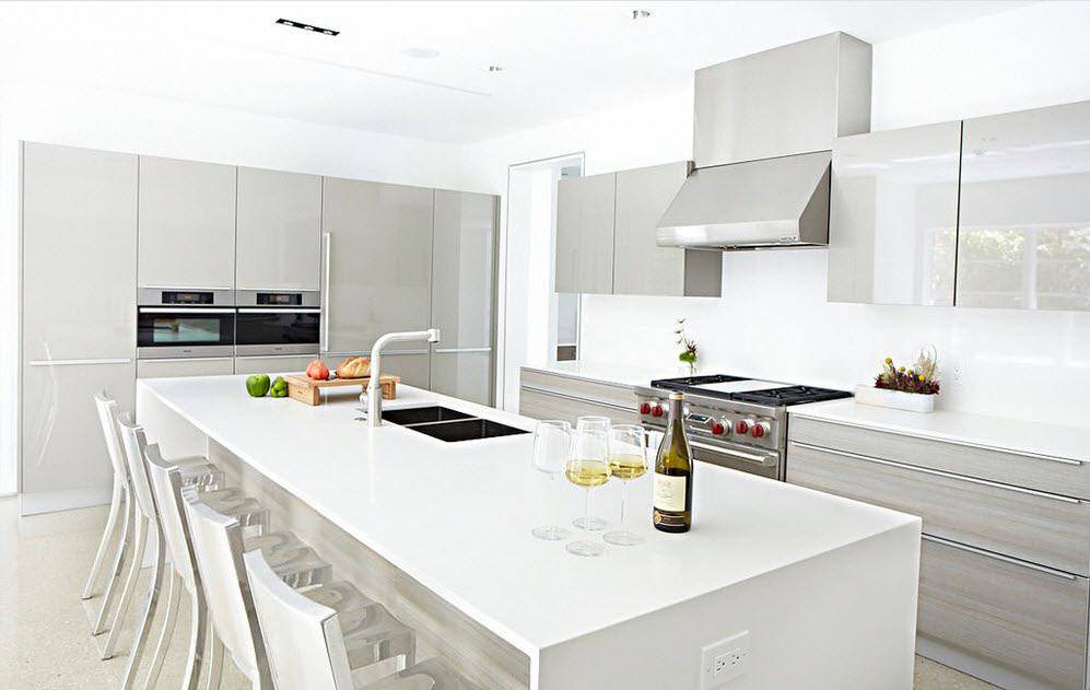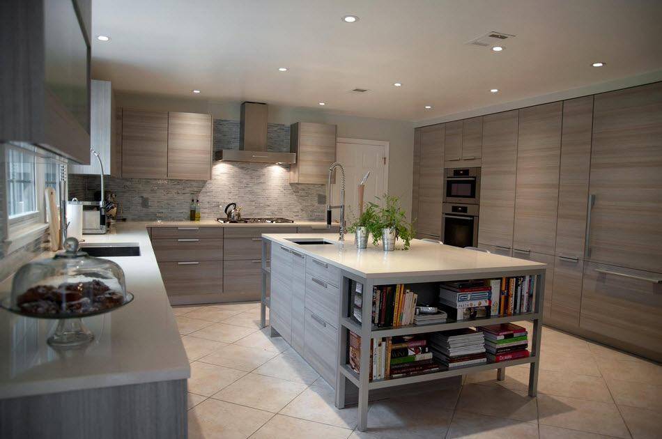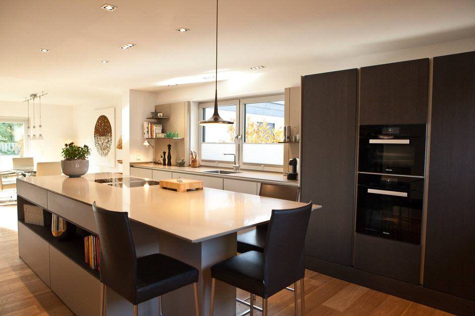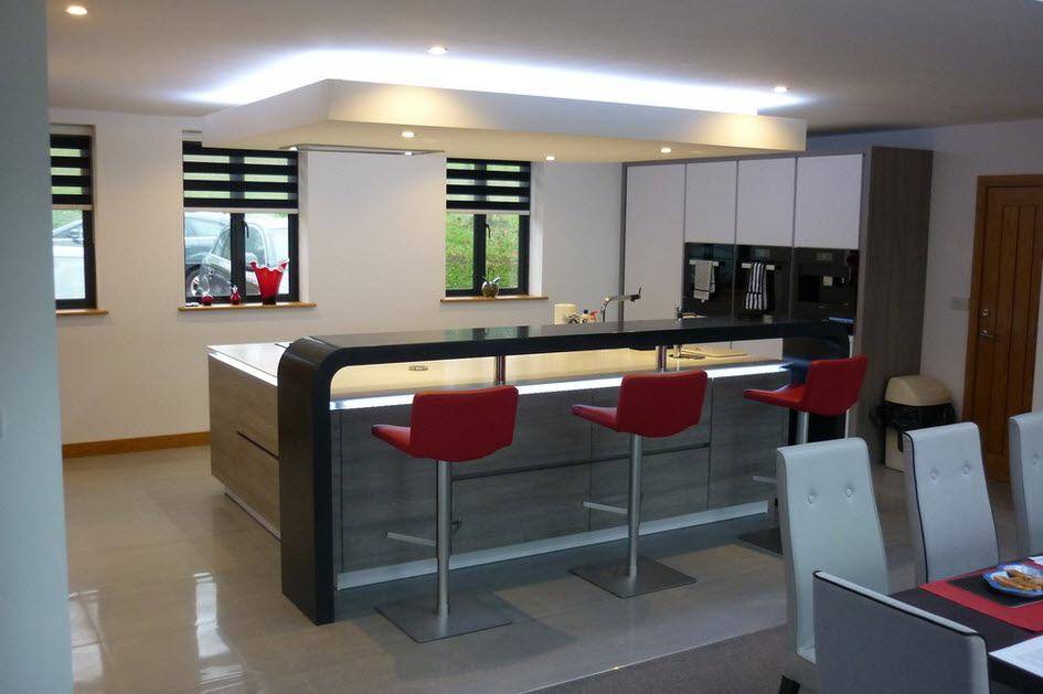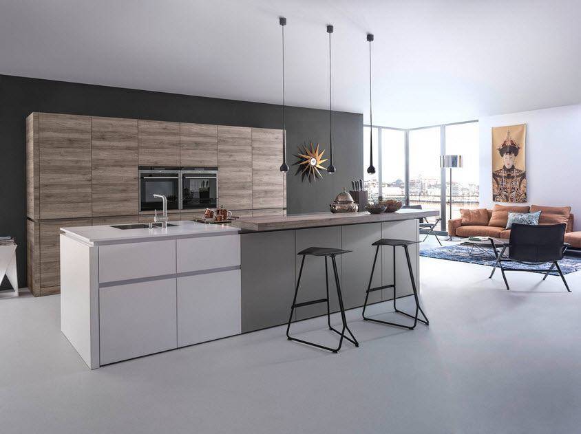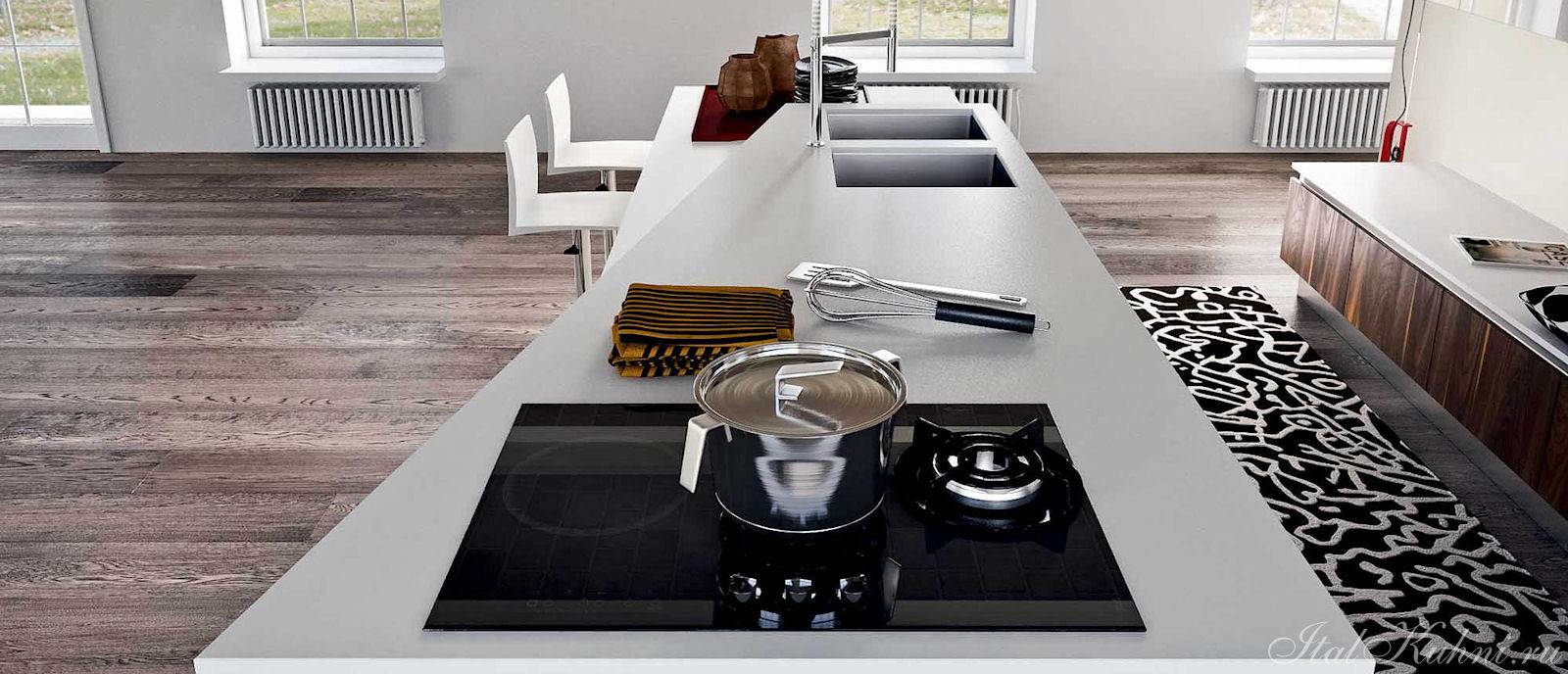 В островной или полуостровной планировке рабочая зона вместе с плитой и мойкой переносится в центр кухни. Кухни с островом выглядят круто, но во-первых подходят только для больших квартир, во-вторых подвести канализацию и воду для мойки на острове непросто. Зато это и выглядит очень дорого.